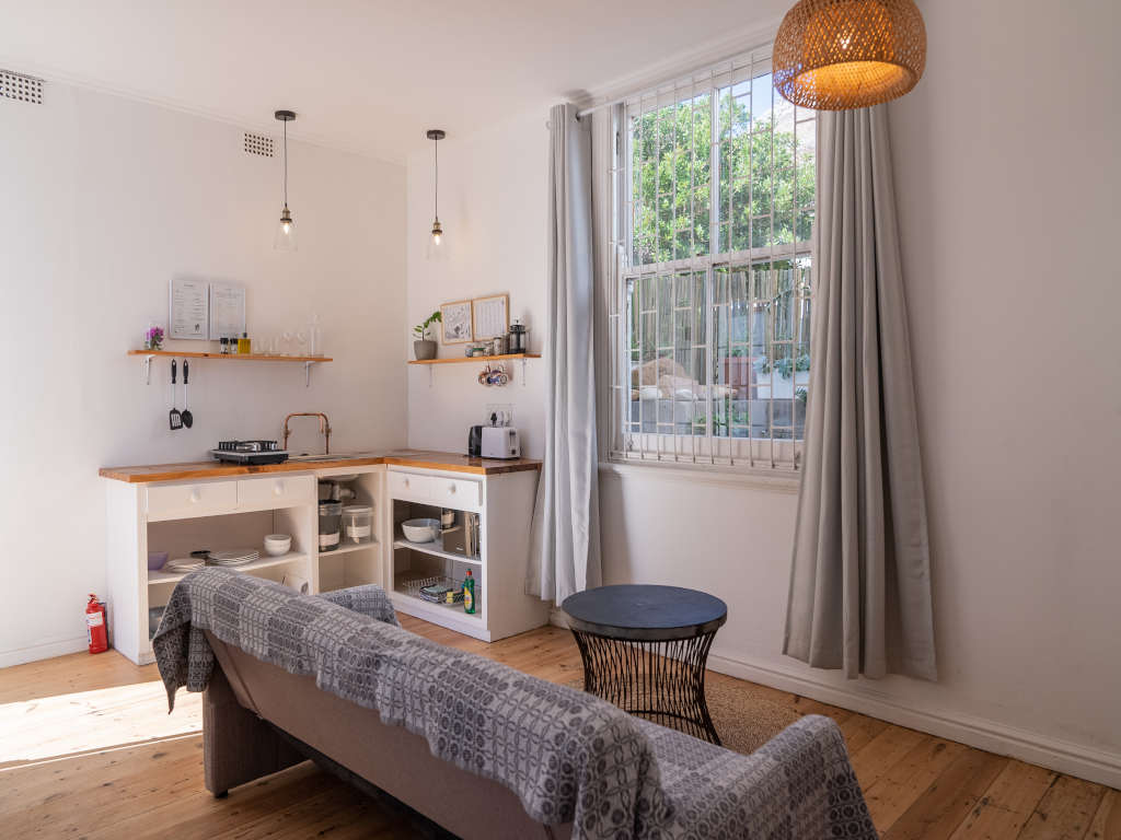 This is a spacious studio with a king bed (or two singles); seating area with table or dedicated work space; a kitchenette and large bathroom with shower. Studio 4 is situated off a large courtyard accessed from the back of the house. The studio has a courtyard view. Perfect accommodation for an individual or couple who are exploring the Cape Peninsula. A 1 minute walk from SAMTRA.